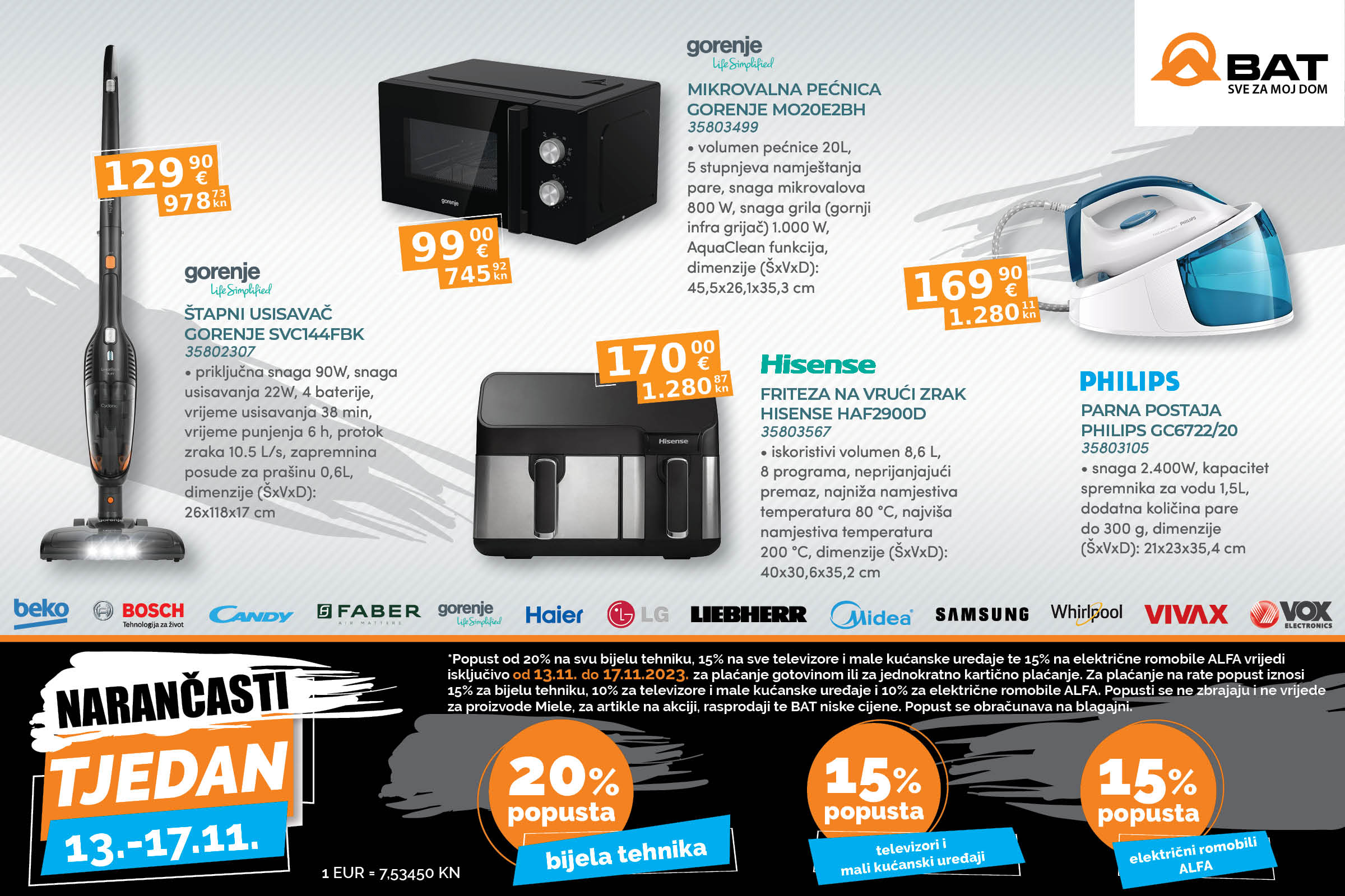 Od 13. do 17.11.2023. popust od 20% odobravamo na sve velike samostojeće i ugradbene kućne uređaje, poput štednjaka, perilica i sušilica rublja, perilica suđa, kuhinjskih ploča i pećnica svih mogućih vrsta i brendova.