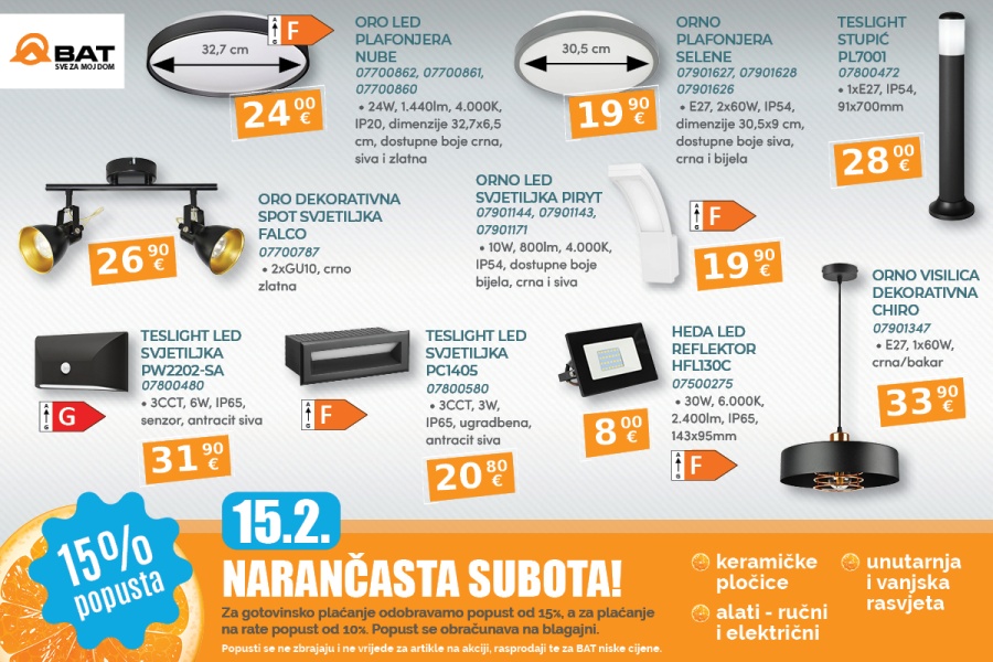 Podsjećamo, popust od 15% se obračunava na sve redovne cijene i vrijedi za plaćanje gotovinom ili jednokratno kartično plaćanje, dok za plaćanje u ratama, popust iznosi 10%. Popusti se ne zbrajaju i ne vrijede za artikle na akciji, rasprodaji te za BAT niske cijene.